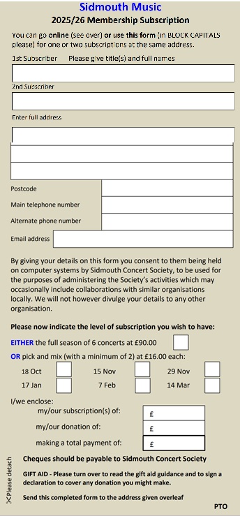 Subscription application forms are also available in Sidmouth Library and Sidmouth Information Centre, as well as at each concert. Alternatively you can email a request for a form to info@sidmouthmusic.org.uk , and we will post one to you.